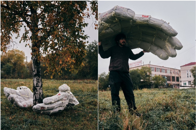 Макет «Рук» уже готов. Накануне художник вынес конструкцию из мастерской на улицу, чтобы посмотреть, как она будет смотреться.