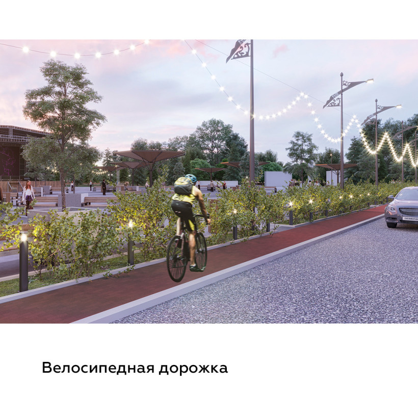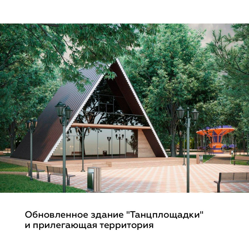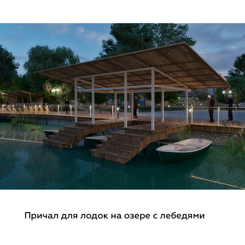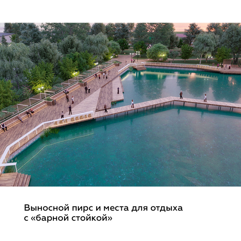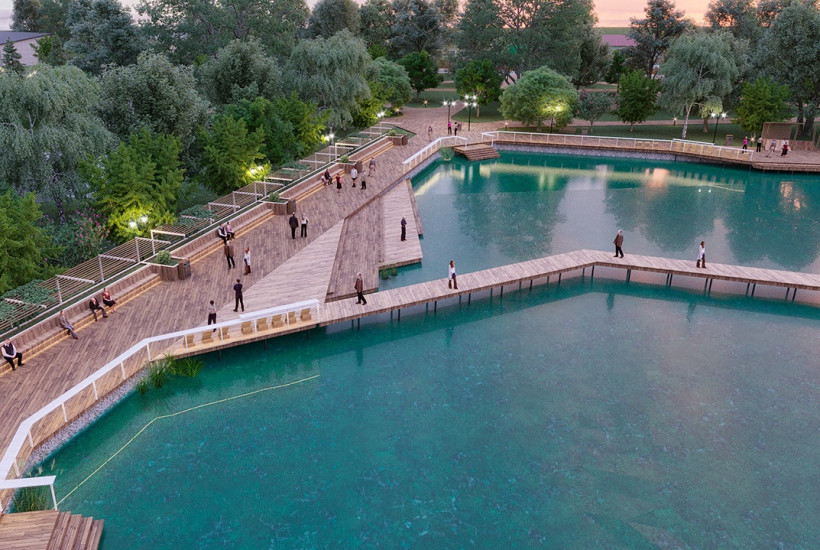 В основе проекта улучшенный парковой комплекс с отдельными зонами. Там можно отдохнуть у озера на шезлонгах, покататься на лодках и велосипедах, а зимой — на коньках. Также здесь предполагается восстановить историческую танцплощадку. Велосипедную дорожку и прогулочные аллеи проложат так, что они свяжут парковый комплекс в единое пространство. В парке также появятся навес на воде с качелями, амфитеатр, зона отдыха с баром, причал для лодок.
