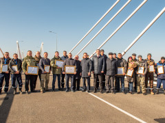 Люди, которые построили первый автомобильный мост из России в Китай, получили сегодня, 24 октября, Почетные грамоты и благодарности председателя российского правительства Михаила Мишустина. Церемония награждения прошла прямо на международном мосту, который уже готов к запуску грузового движения. Все награждаемые — монтажники, плотники, механики, машинисты бульдозеров и инженеры — участвовали в строительстве мостового перехода с первых дней.