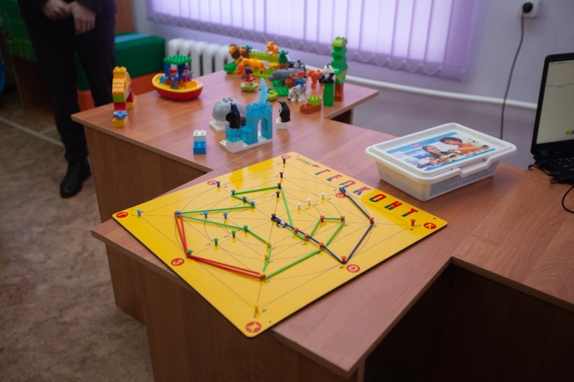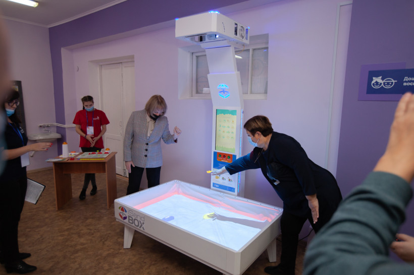 После торжественной части преподаватели колледжа похвастались новым оборудованием. Конечно, интерактивными досками даже с выходом в интернет сейчас не удивишь, а вот огромная интерактивная песочница, где можно не только играть, но и развивать ловкость, внимательность, привлекла внимание гостей. Министр даже с удовольствием поиграла — полопала разноцветные виртуальные шарики.