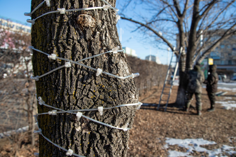 — Сейчас мы монтируем светодиодную ленту на деревьях в сквере за зданием правительства Амурской области. На этот сквер запланировано примерно 5 километров ленты. На каждое дерево уходит 40—50 метров, — рассказал об этапах работы представитель подрядной организации ООО «Тандем» из Владивостока. — Это светодиодная лента «Неонеон», она светит теплым белым светом, выдерживает морозы до 45 градусов, не дубеет и не рвется. Лента хорошо заизолирована и безопасна как для окружающих, так и для самих деревьев. Все это делается для того, чтобы радовать жителей города, поэтому мы надеемся, что благовещенцы — люди сознательные, добропорядочные и не будут портить новогоднюю иллюминацию.
