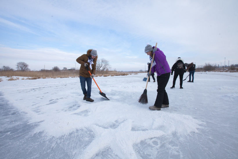 Так и вышло: когда ребята вышли на лед с лопатами, проезжающие мимо автомобили приветствовали их сигналами. Изначально молодогвардейцы планировали приехать в составе 20 человек, однако добрались до места назначения меньше половины.