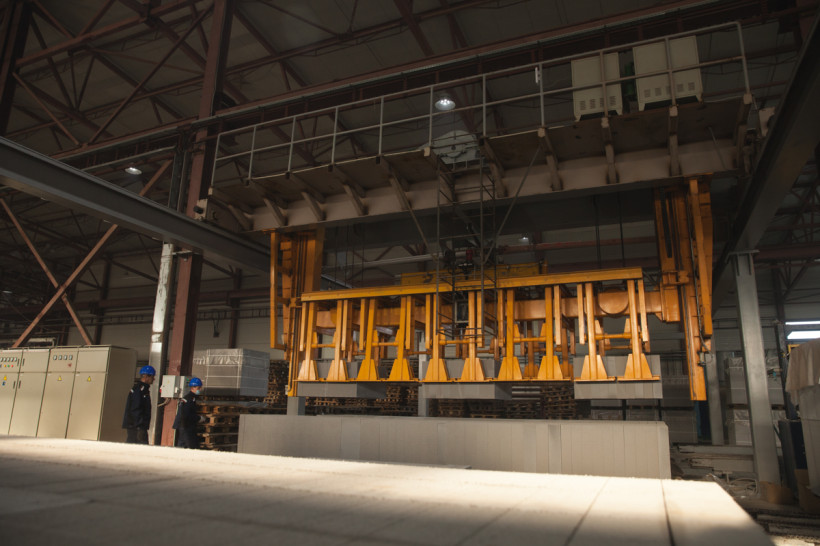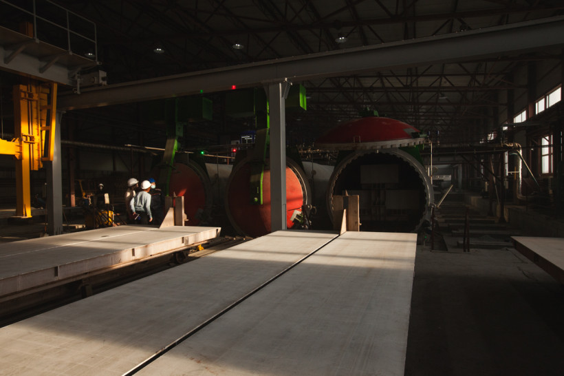 По желанию заказчика блоки могут нарезать практически любой длины и ширины (в разумных пределах, конечно). Автоматика позволяет из одной плиты сделать несколько видов «кирпичей». Затем манипуляторы отправляют блоки в автоклавы. Это огромные горизонтальные цилиндры высотой в два человеческих роста.