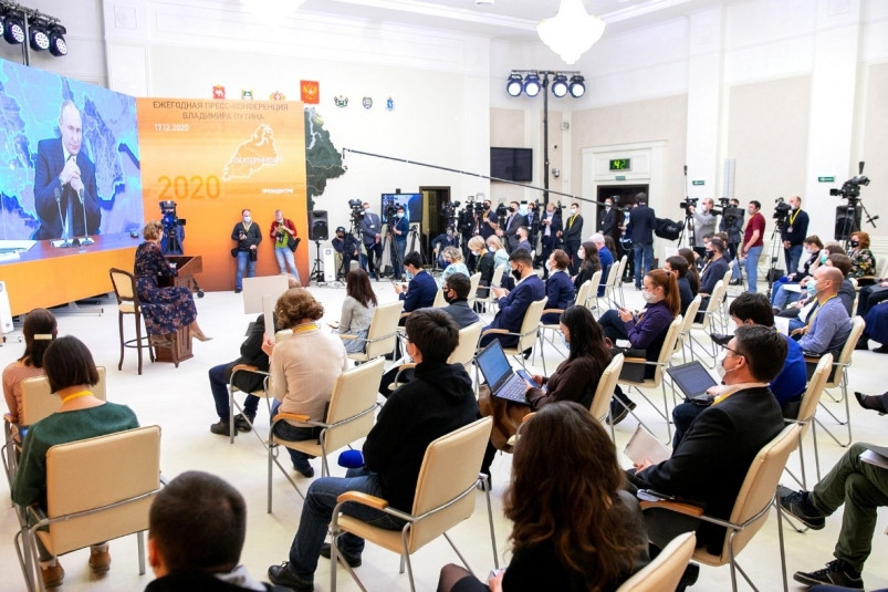 Режим «дистанционки», ставший уже привычным россиянам за этот год, не обошел и пресс-конференцию Владимира Путина. Из-за пандемии журналистов со всей страны не стали собирать в Москве, а устроили телемосты с каждым регионом. Сам Владимир Путин находился в подмосковной резиденции президента в Ново-Огарево с ограниченным количеством журналистов кремлевского пула. Представители иностранных и большинство российских федеральных СМИ разместились в Центре международной торговли в Москве, а для регионалов организовали площадки в Туле, Санкт-Петербурге, Ростове-на-Дону, Ставрополе, Нижнем Новгороде, Екатеринбурге, Новосибирске.