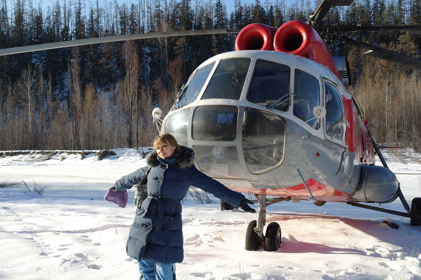 Я потерялась в пространстве сразу после того, как из вида пропал Новокиевский Увал, откуда мы стартовали. И на весь полет прилипла носом к иллюминатору. Почти все время под нами была заснеженная тайга. Сплошные деревья и блестящие под солнцем белые полосы рек. Было очень красиво. А еще очень холодно. Впрочем, это не помешало мне стянуть шапку ради фотографии на фоне вертолета.