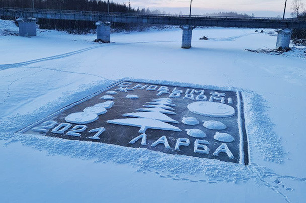 В Ларбе тем утром было -42. Ветра нет, и снега нет — то есть открытку восстанавливать не надо. Вроде бы. «Изморозь все равно идет, сейчас надо будет между буквами подмести, — замечает председатель. — Если хотим, чтобы хотя бы до Нового года открытка дожила в своем виде. А если снег выпадет — ну да, чистить придется. Буквы совсем замерзли, свежий снег от них раскидать — небольшое дело совсем».
