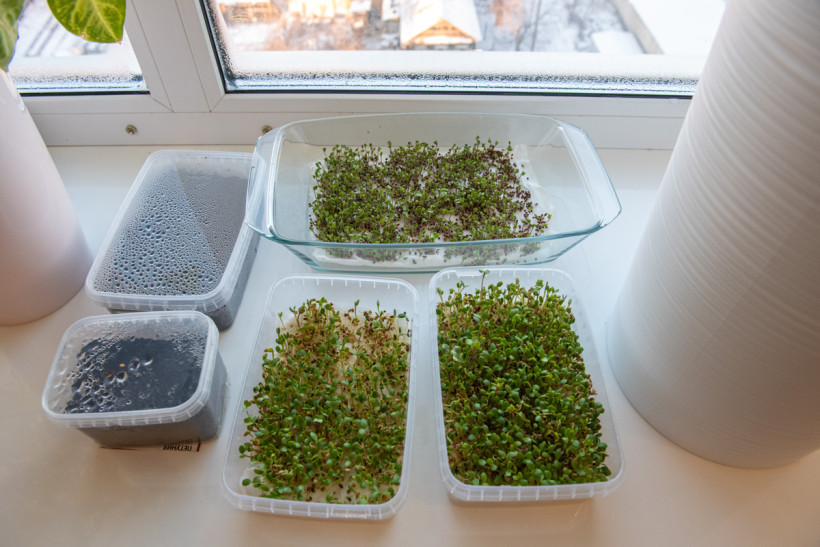 — На самом деле все оборудование для проращивания вы можете найти на собственной кухне. Для лотков я могу использовать, например, одноразовые контейнеры для печенья, пластиковые емкости. Сейчас очередной микс растет в плоской крышке от жаровни, — делится опытом энтузиаст. — Семена придется покупать в любом случае, цена на них в магазинах примерно одинаковая. Можно взять больший объем, чтобы получилось дешевле.