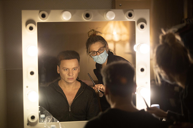 Пока мы говорим с Натэллой Ивлевой, из-за двери преподавателя по вокалу Марины Полтевой раздается песня Эдуарда Хиля — кто-то репетирует свой номер. Забегая вперед, скажем: когда артист, который будет на сцене в этом образе, появился в коридоре, мы его не сразу узнали. А точнее — вообще не узнали, кто скрывается под пластическим гримом. И только уже во время съемок стало понятно, кто скрывался под «маской» знаменитого советского исполнителя.