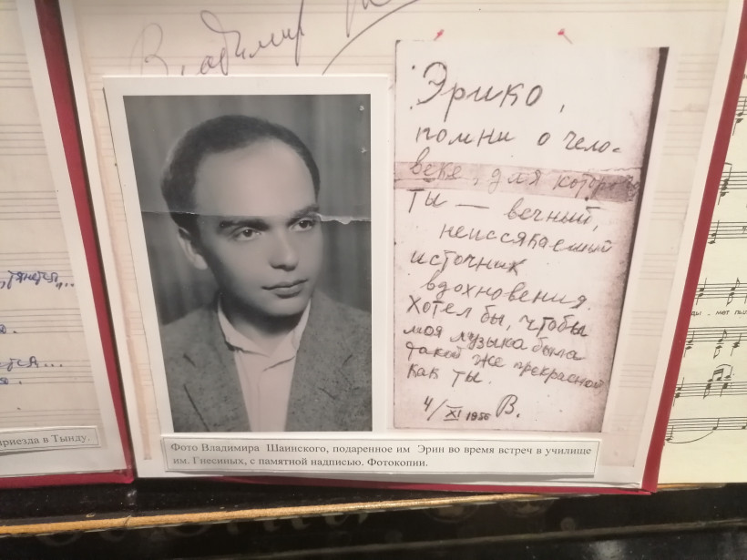 На музыкальном инструменте можно увидеть не менее уникальные предметы — фотокопию нот песни о БАМе, написанной Владимиром Шаинским во время его приезда в Тынду. Здесь же представлена фотография композитора и его памятная надпись Эрин Олеговне, с которой он встречался в училище им. Гнесиных.