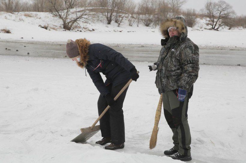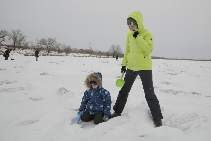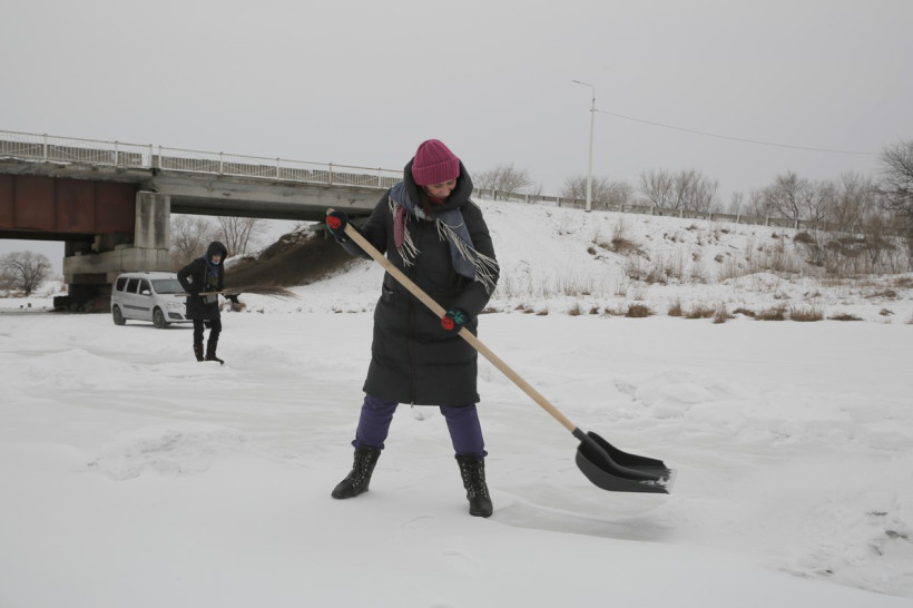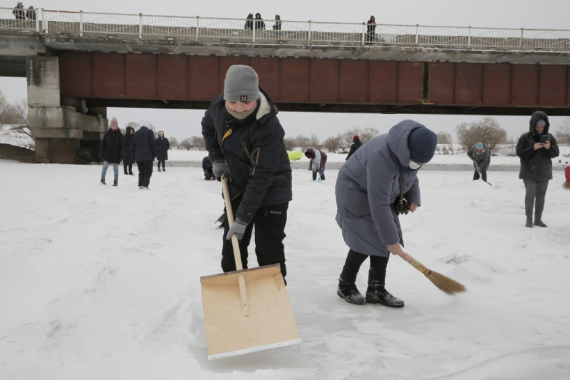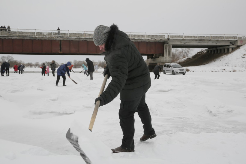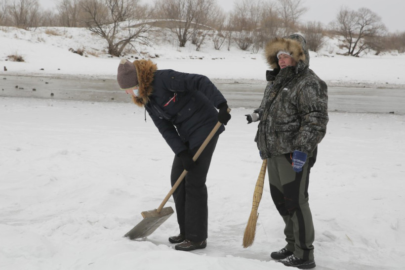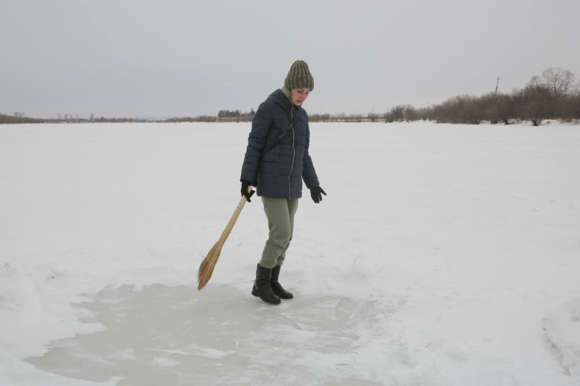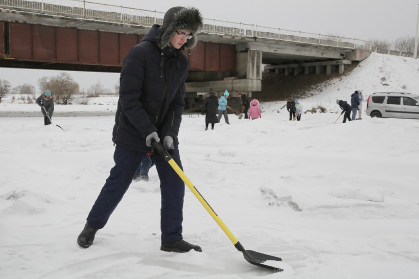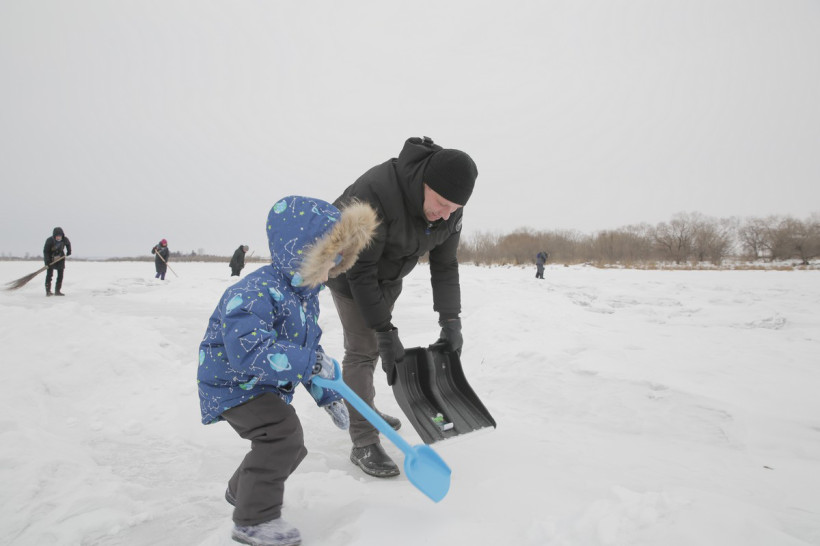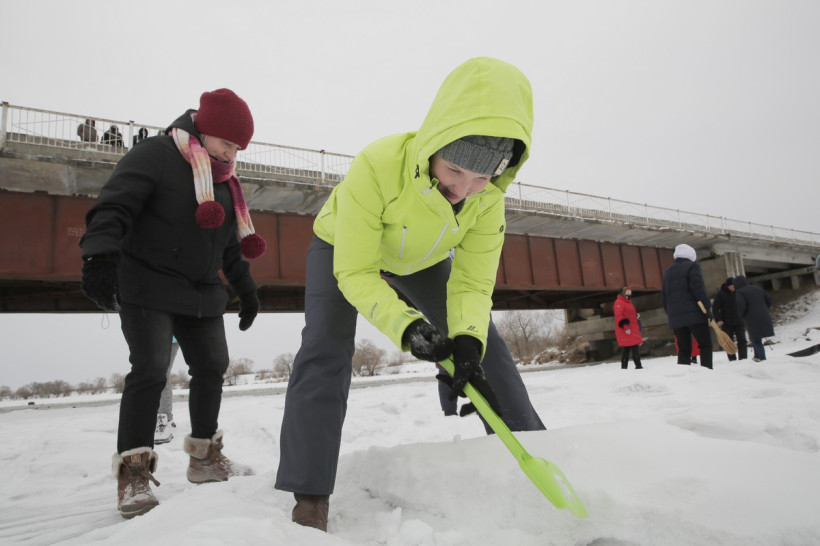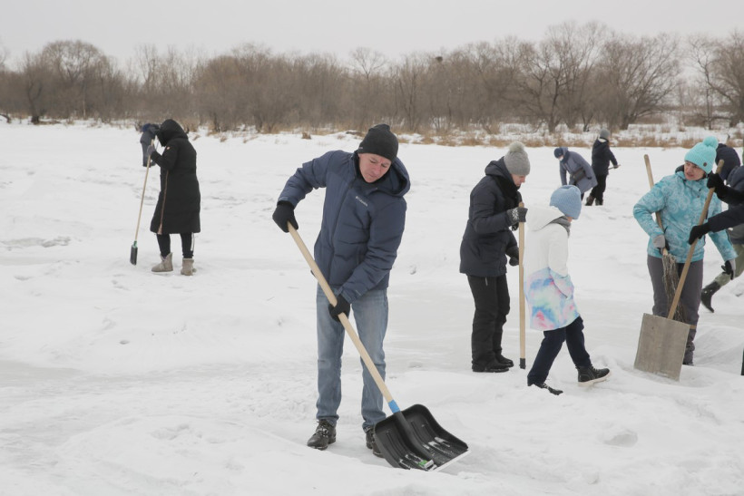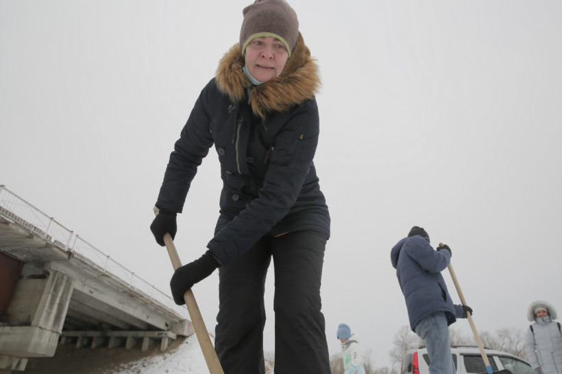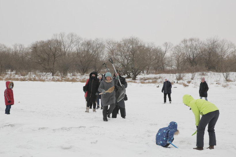 На пронизывающем ветру в ожидании туристического автобуса возле ОКЦ в Благовещенске кучковался народ. Резкая перемена погоды не перебила желание смельчаков увидеть знаменитую ледовую открытку в память о глухом художнике Валерии Мельникове из Маркова. Не только увидеть, но и самим прикоснуться к ледовому волшебству, вооружившись лопатами и метлами.
