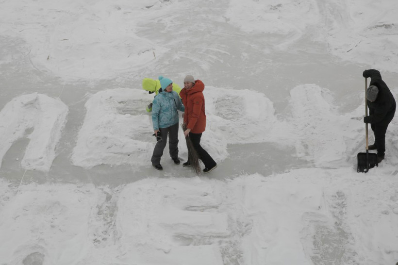 «Неужели мы это осилим?!» — такая мысль посетила всех, когда только приступали к работе. Минут через двадцать на льду появились первые просветы, а через час уже можно было прочитать: «Деду Валерию посвящается!»