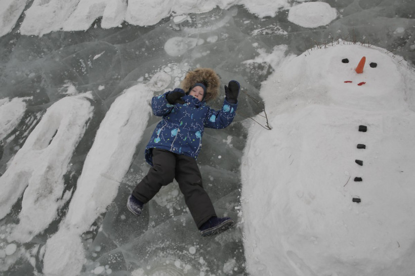 «Не туда идете. Там хоккейная коробка, открытка справа», — подсказал кто‑то из местных. Развернувшись, туристы с растерянным видом стали вглядываться в белое поле с другой стороны моста: какие‑то подтаявшие снежные глыбы, по очертаниям которых сложно было угадать ледовую открытку. Гуськом народ потянулся вниз к реке, где ветер дул так сильно, что от мороза слезились глаза.