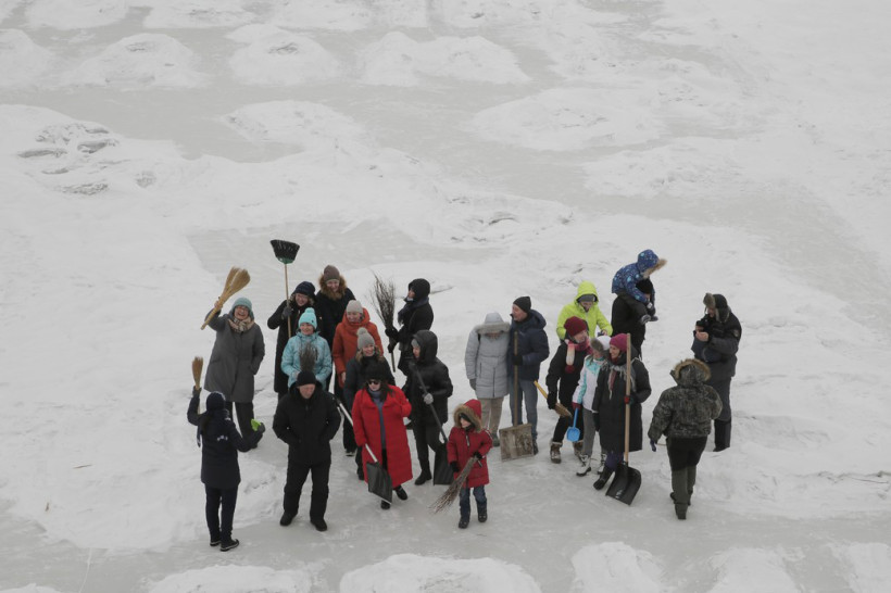 В таком же положении оказались многие. Минут пять туристы бродили среди сугробов, не зная с чего начать. Хорошо, что среди экскурсантов был Алексей Гертман — пожарный-пенсионер, который помогал известному скульптору и архитектору Алексею Сидорову в ноябре рисовать на льду эту самую открытку. Его советы помогли. Постепенно народ рассредоточился по периметру и активно замахал лопатами.