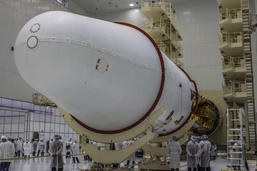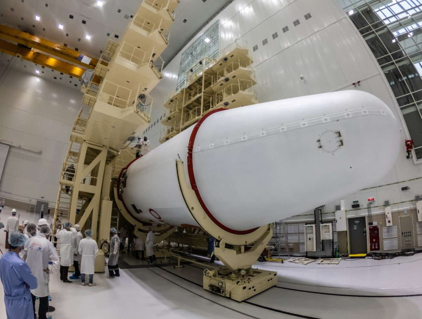 Накануне специалисты центра «Восточный» с помощью трансбордерной галереи транспортировали собранную ранее космическую головную часть в монтажно-испытательный корпус ракеты-носителя. В нее входят разгонный блок «Фрегат» и установленные на переходной ферме космические аппараты спутниковой компании OneWeb. Затем головную часть состыковали с третьей ступенью «Союза-2.1б» в зале сборки космодрома.