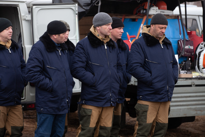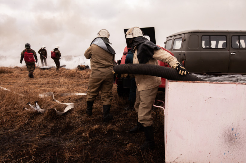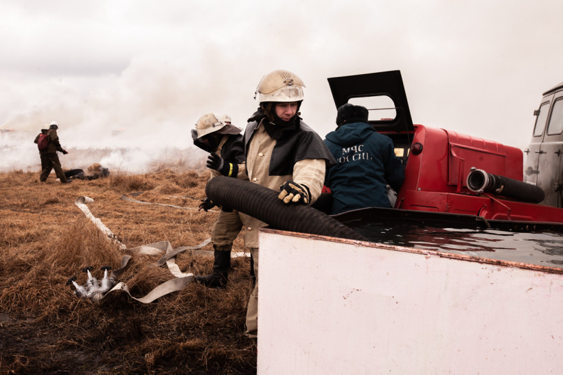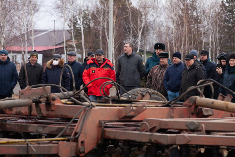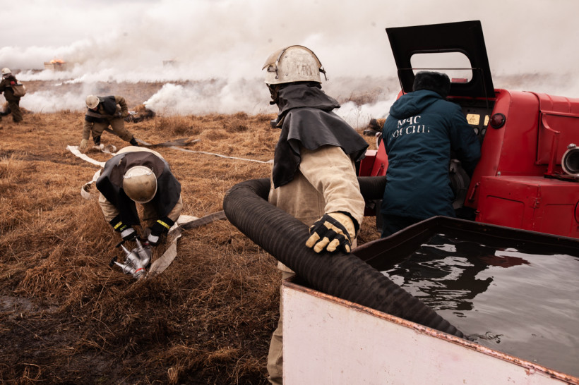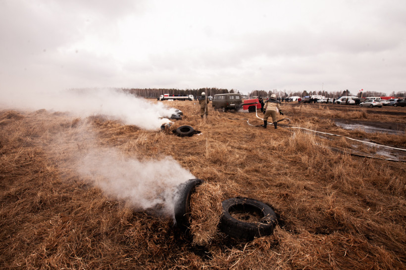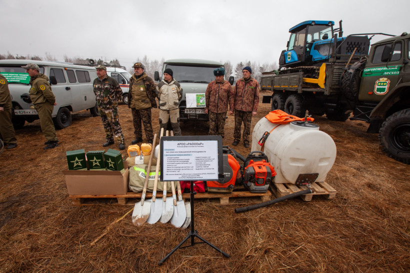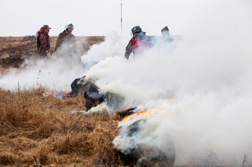 Мотопомпы, бензопилы, емкости для воды, автомобили повышенной проходимости — главам районов продемонстрировали спецодежду и полное снаряжение спасателей, пожарных и сотрудников авиабазы. Принципами своей работы также поделились охотоведы, работники лесхозов и добровольцы. На небольшом пространстве, заросшем прошлогодней травой, специалисты показали способы очистки населенных пунктов от сухой растительности, а затем с применением тяжелой техники обустройство защитных минерализованных полос.