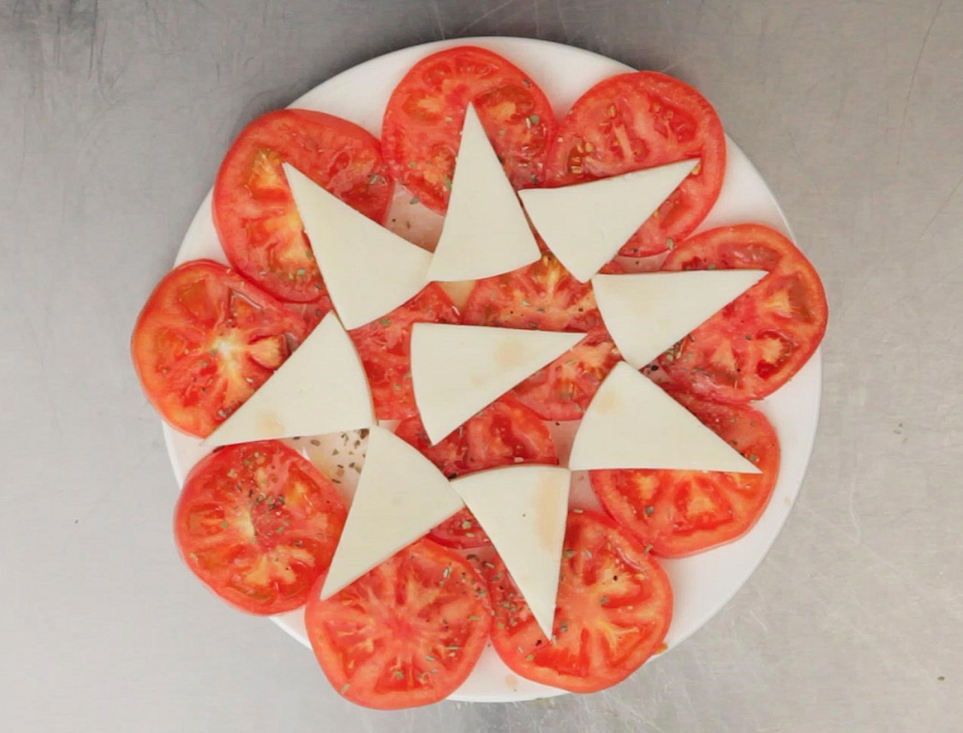 Нарезать помидоры кружочками и выложить на тарелку. Сбрызнуть кунжутным маслом и уксусом, посыпать солью и орегано. Нарезать сыр и выложить его на помидоры. Дать блюду постоять 30 минут, чтобы помидоры впитали в себя специи и ароматы.