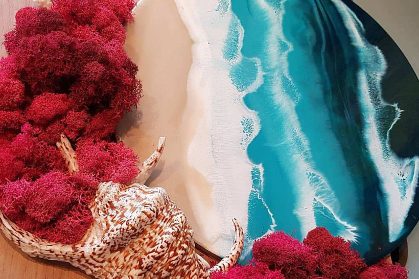 — На своих мастер-классах я рассказываю ученикам о том, как правильно смешивать смолу, чтобы на поверхности работы не оставалось ненужных пузырьков, как выбирать пигменты и красиво раскладывать стеклянную крошку, искусственные камни. Последние можно использовать и натуральные, но они в сравнении с искусственными дороже в несколько раз. Стоимость готовых работ, которые сегодня предлагают мастера, может быть разной и обычно начинается от 25 тысяч рублей за квадратный метр. Цена зависит от используемого материала и сложности рисунка. Если в изделии несколько слоев смолы, которые создают эффект 3D, то цена выше, — поясняет художник-смолянист. — Научиться азам техники можно за день-два. Этой зимой у меня были ученики, молодая пара, которые 14 февраля отметили в моей мастерской День святого Валентина и сделали себе своими руками оригинальный подарок. В работах можно использовать не только камни и стекло, но и морские раковины, которые многие из нас привозят из отпуска, а потом эти раковины пылятся в шкафу. Красивому природному материалу можно найти оригинальное применение, сделав сувенир-воспоминание об отдыхе. Смола полет фантазии не ограничивает.