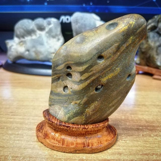 К примеру, на большом камне, что Роман Николаев привез с южного побережья острова Сахалина, отпечаталась раковина двухстворчатого моллюска. А другой продырявлен, словно на нем практиковались дрелью. Хотя, скорее всего, это следы жизнедеятельности какой-то морской или речной живности. Или вовсе это может быть окаменелая деревяшка с сохранившейся на ней «работой» жуков-древоточцев.