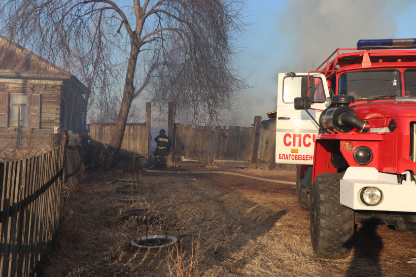 Три машины и 15 пожарных тушили загоревшийся дом в Благовещенске