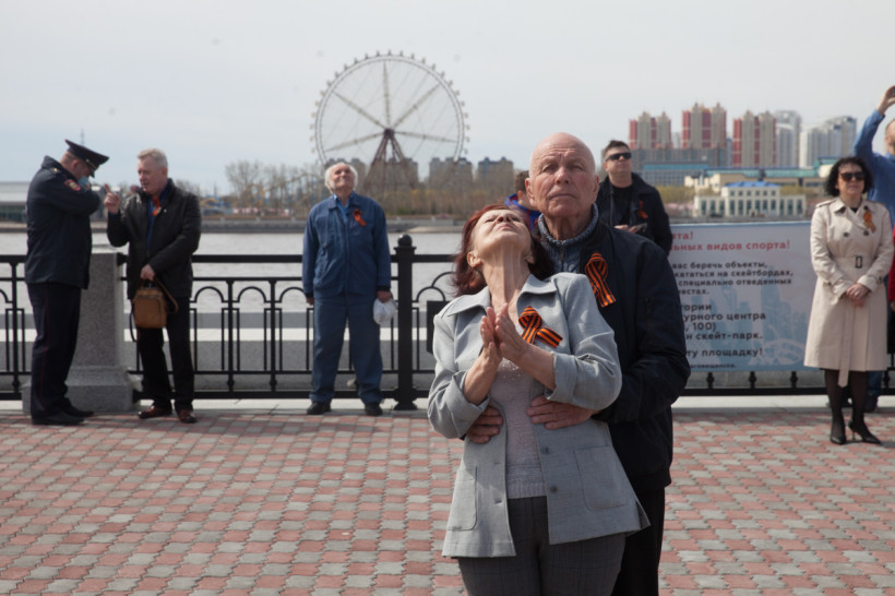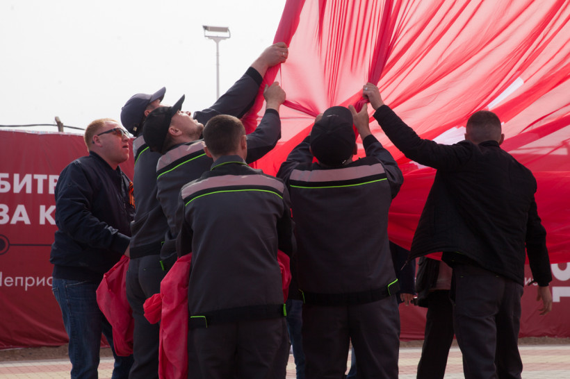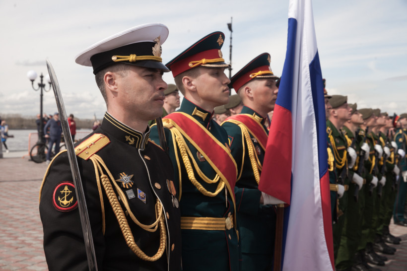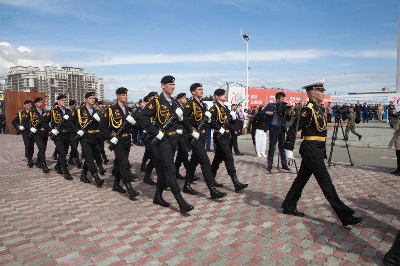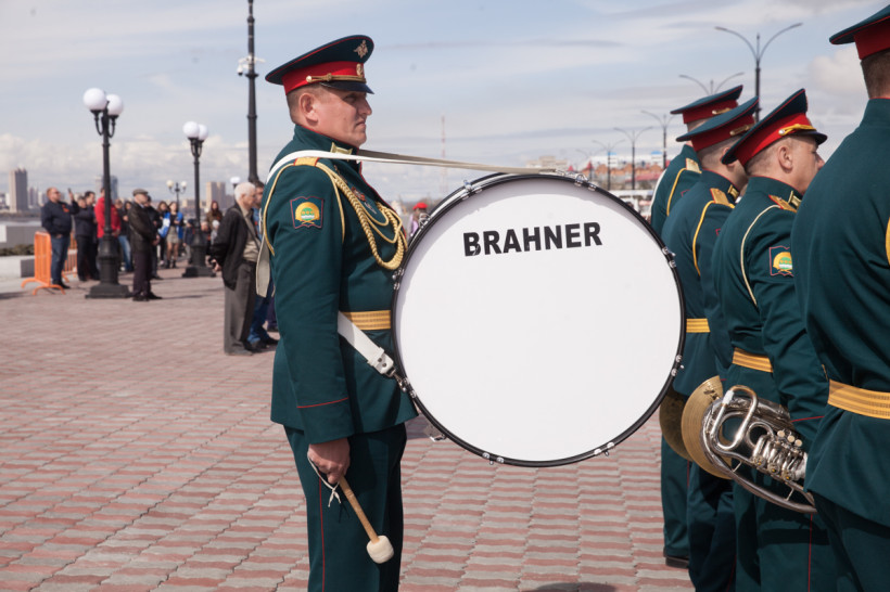 После торжественных речей оркестр ДВОКУ грянул гимн России, и Знамя Победы стало медленно подниматься вверх. После главной торжественной песни страны музыканты заиграли мелодию, без которой не обходится ни одно 9 Мая — песню «День Победы», и именно в этот миг порыв ветра развернул алое полотнище.