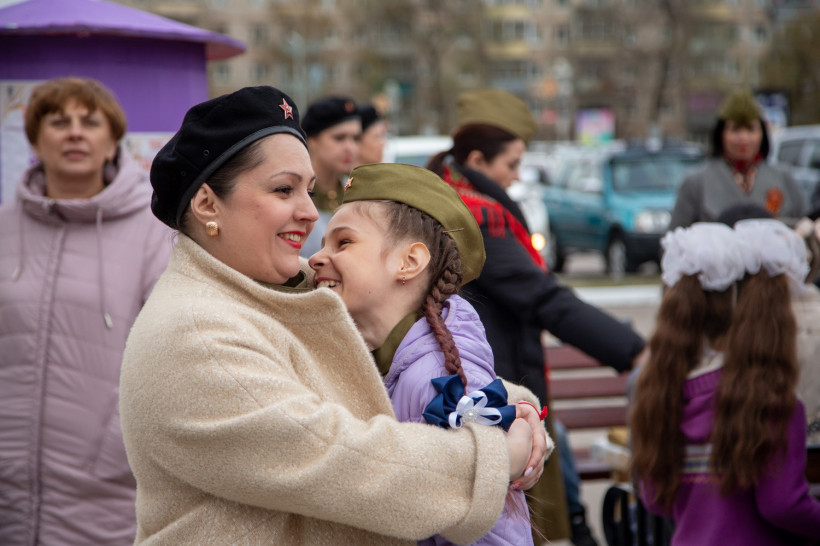 — На территории ОКЦ уже четвертый год проходит акция «Рио-Рита — радость Победы», — рассказала генеральный директор ОКЦ, депутат Законодательного собрания Надежда Багрова. — Мы пытаемся воссоздать ту праздничную атмосферу, которая царила в «шесть часов после войны», когда в городе зазвучал военный духовой оркестр, а пары закружились в танце. Девушки и женщины у нас по традиции в ситцевых платьях с белыми воротничками или в горох, в расклешенных юбках, мужчины — в форме. Дети играют в шашки, раздают газеты. Огромный плюс, что в этом году акция все-таки состоялась. Мы видим, что люди соскучились по таким мероприятиям, танцуют все с удовольствием.
