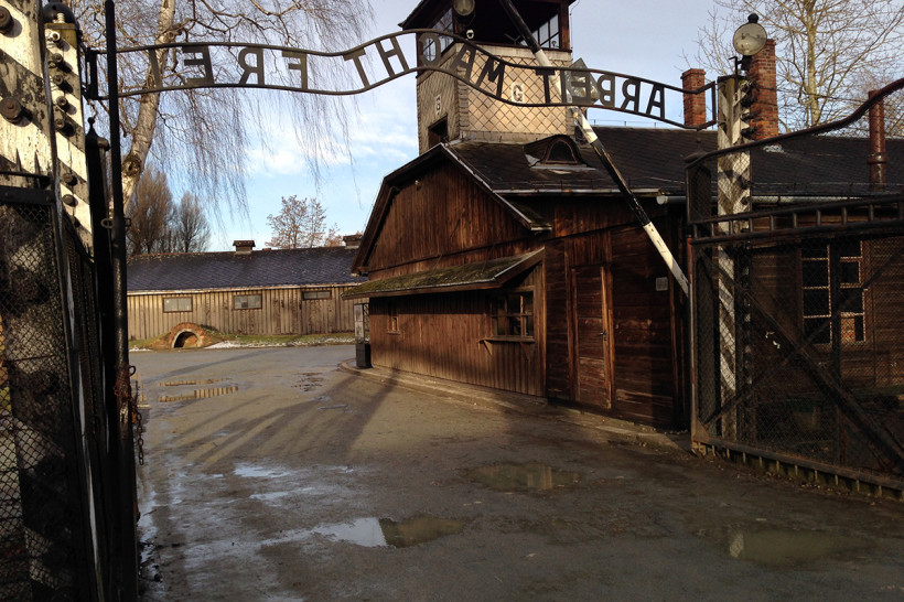 В Аушвице над главными воротами тоже висит надпись Arbeit macht frei. Сам лагерь находился в центре города, мимо него во время войны каждый день проходили тысячи людей — это сильно отличает его от других лагерей, большинство из которых были построены за городом.