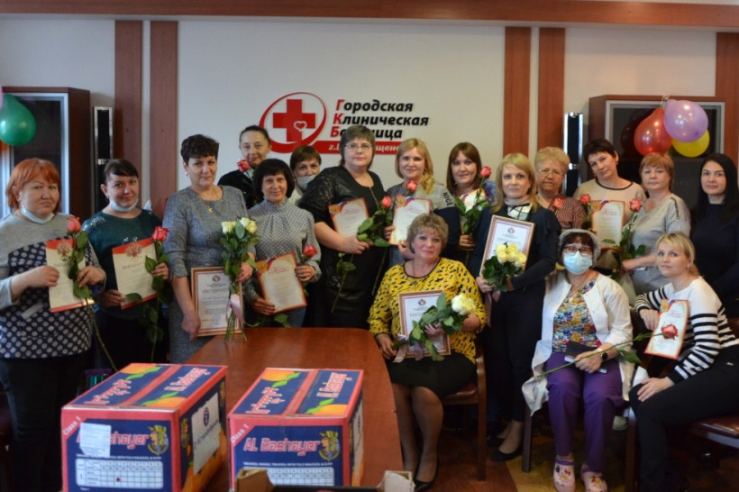 На мини-торжество в конференц-зале больницы собрались около 20 медработников. Разумеется, несмотря на праздник, лично присутствовать смогли не все, так как находятся в «красной» зоне и работают с пациентами. Но для них была организована прямая трансляция.