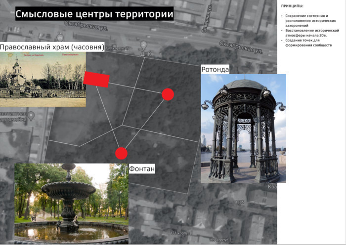 Так, автор одном из вариантов предлагает на одной из частей кладбища устроить беговые дорожки, а на другой — исторической — создать музей под открытым небом, где можно было познакомиться со стилизованными под 19-й век вещами — повозкой, фонарями, скамейками. А еще по сохранившимся фотографиям воссоздать исторические ворота. Если не на историческом месте, которое сейчас — центр квартала, а со стороны входа с улицы Октябрьской.