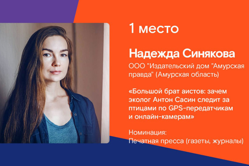 • 1 место — Надежда Синякова, «Большой брат аистов: зачем эколог Антон Сасин следит за птицами по GPS-передатчикам и онлайн-камерам» (Благовещенск, ООО «Издательский дом «Амурская правда»);
