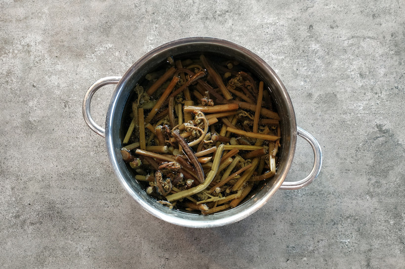 Папоротник залейте соленой водой из расчета 3 ст. л. соли на 2 литра воды и оставьте на 5—6 часов. После чего слейте воду и залейте свежей порцией соленой воды в той же пропорции, оставьте еще на 5—6 часов. Воду слейте. Варите папоротник в три приема: залейте примерно 2 литрами воды, доведите до кипения, слейте. Вновь залейте свежей водой, доведите до кипения, слейте. И в третий раз залейте свежей водой, доведите до кипения, кипятите 2 минуты, слейте и ополосните холодной водой. Откиньте на сито, дайте всей воде стечь. При таком способе вымачивания и варки никакой горечи в папоротнике не остается. И папоротник не переварен.