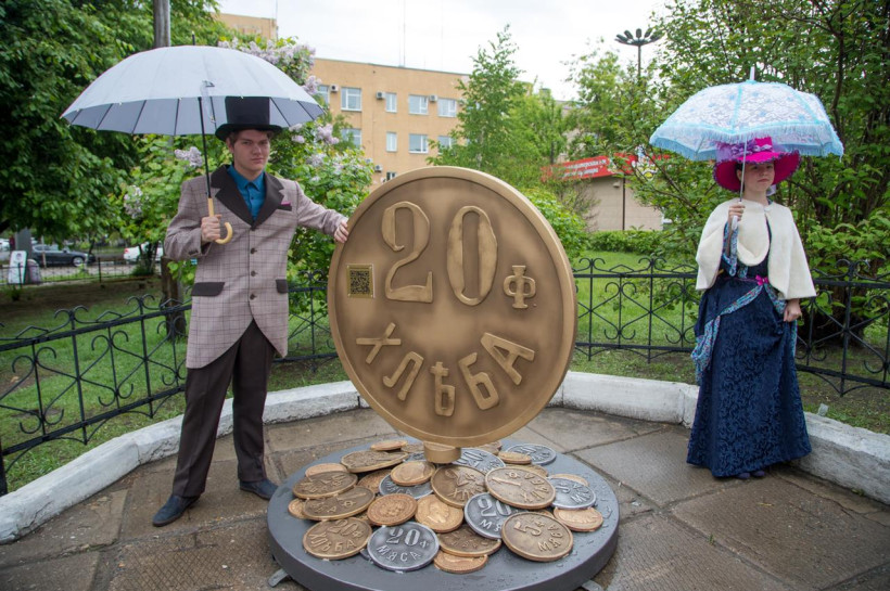 Огромную копию уникальной монеты, придуманной благовещенским купцом, почетным гражданином города Глебом Петровичем Лариным, установили вчера возле ЦУМа. Место выбрано не случайно, в этом районе до 1980 года располагалась оживлённая торговая площадь.