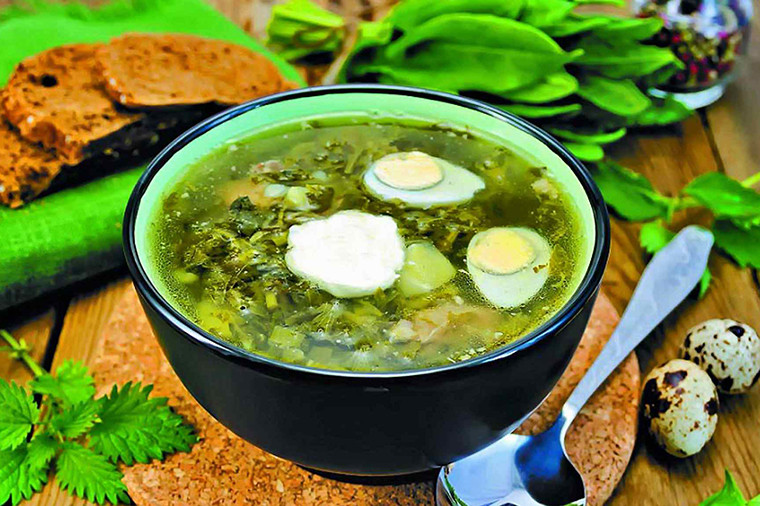 Варить щи из крапивы можно на любом мясном бульоне. Мне больше всего нравится на свиных ребрышках или домашней курице, чтобы положить кусочек вкусного мяса в тарелку горячих щей. Для подачи также обязательно нужна сметана и вареные яйца. Без этого никак!