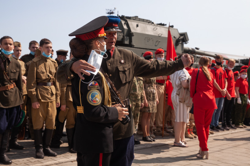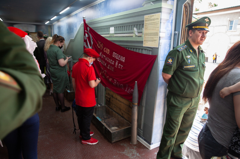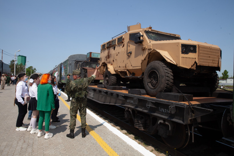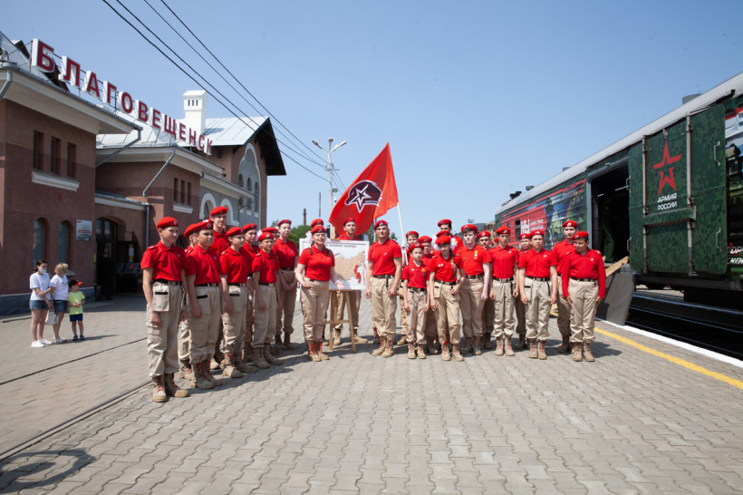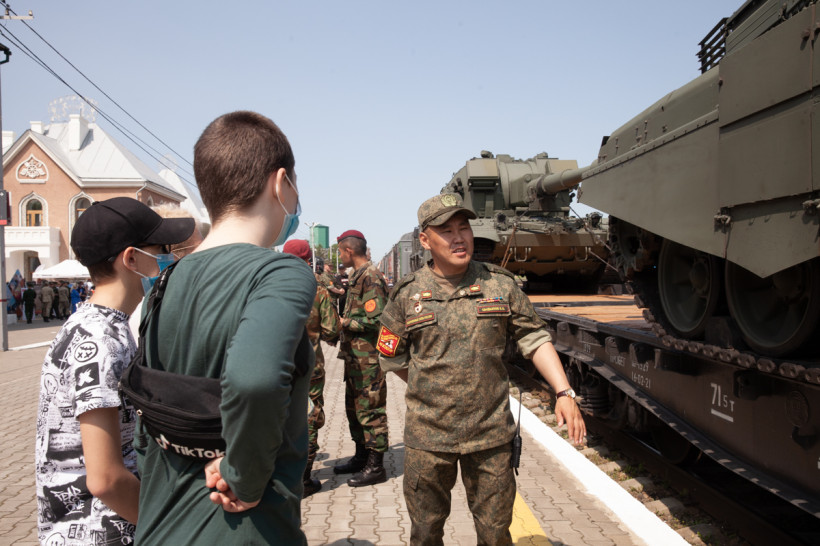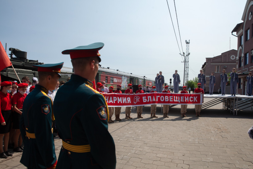 От Москвы до Владивостока едет специальный поезд Министерства обороны РФ. В 17-ти вагонах и открытых платформах — новейшие танки и образцы оружия, защитные костюмы группы разминирования и оснащение военных медиков, исторические экспонаты времен Великой Отечественной войны и даже передвижная церковь. Благовещенск в среду, 8 июня, стал 37-й остановкой для уникальной выставки «Мы армия — страны! Мы армия — народа». В столице Приамурья за несколько часов на мероприятии побывали около десяти тысяч человек.