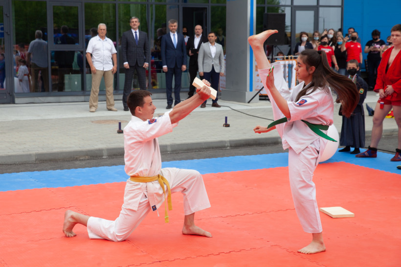 На площадке перед комплексом шумно и ярко: около ста ребят вместе со своими тренерами собрались на самое значительное событие для любителей боевых искусств. Они будут тренироваться в современном и оснащенном с помощью самых передовых технологий спорткомплексе. Амурский филиал Российского союза боевых искусств объединяет 24 спортивных организации. Под одной крышей ФОК объединит четыре федерации: рукопашного боя, спортивной и вольной борьбы, ушу и карате. Остальные будут проводить соревнования в новом здании — турниры обещают проводить каждые выходные.