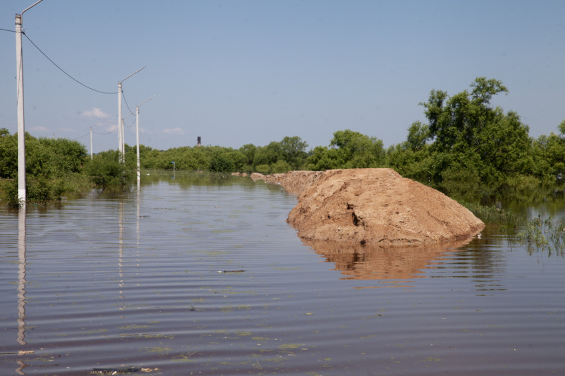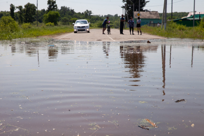 Наша редакционная машина выехала в командировку в первой половине четверга, 24 июня — сразу, как только в сводках появилась информация о первых затопленных домах в селе Марково Благовещенского района. Жуткие фотографии с места нам прислали и читатели АП. Однако добраться до населенного пункта не удалось. Сухая трасса закончилась в районе Игнатьева. Дальше — бескрайняя водная гладь. Паводок не остановила даже высокая песчаная насыпь, растянувшаяся вдоль дороги почти на километр.