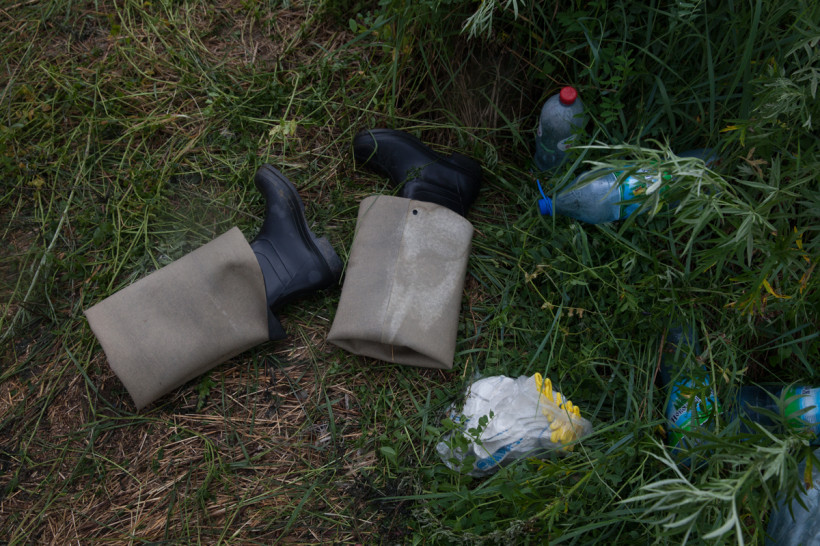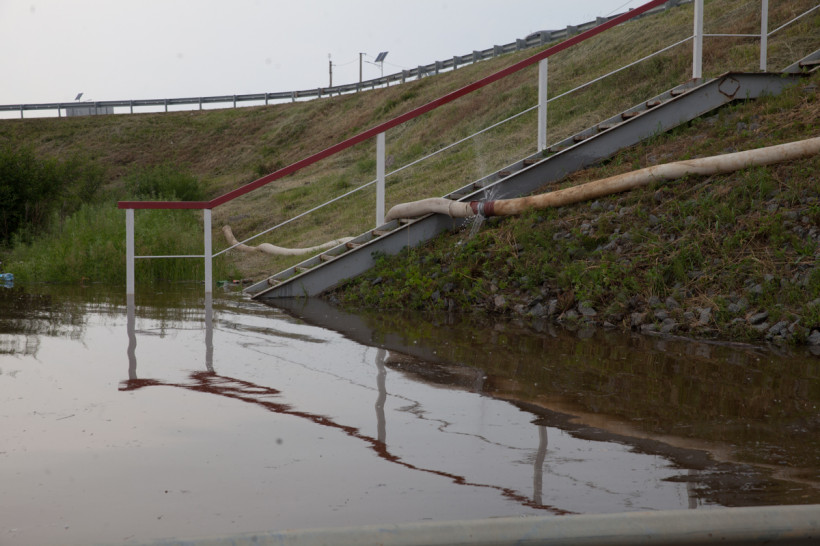 Въезд в село перегораживает вода и гора песка, которую отсыпали жители Владимировки. Тут же пожарный рукав, с его помощью пытаются убрать хоть немного воды на границе населенного пункта. Подойти к въезду даже в резиновых сапогах — задача непростая. На последних метрах мои сапоги предательски сдались и до краев начерпали воды.