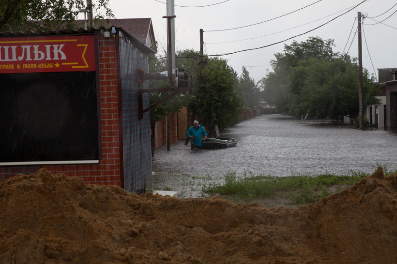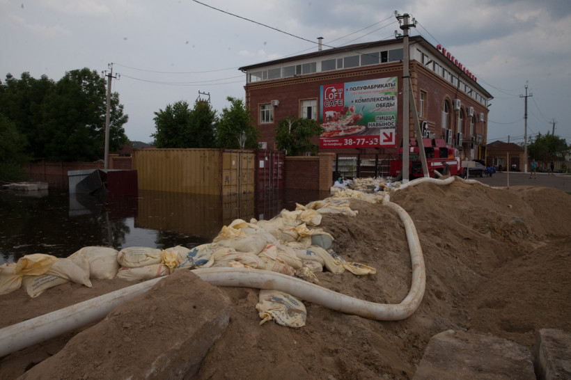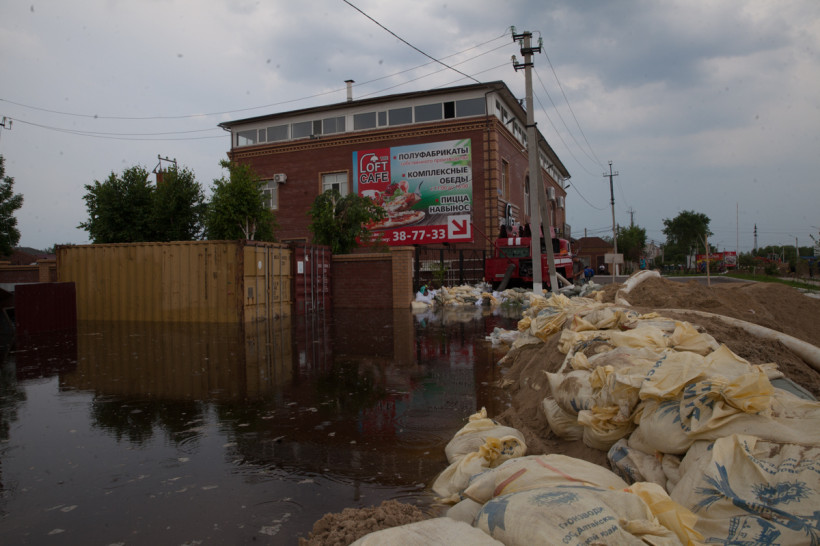 Сразу на въезде — центральный универсам и автомойка. В магазине раздают бесплатные пирожки сотрудникам МЧС, которые откачивают воду, и волонтерам, работающим на дамбе. Рядом своеобразная лодочная станция, куда жители утонувшей части села пришвартовывают свои резиновые лодки.