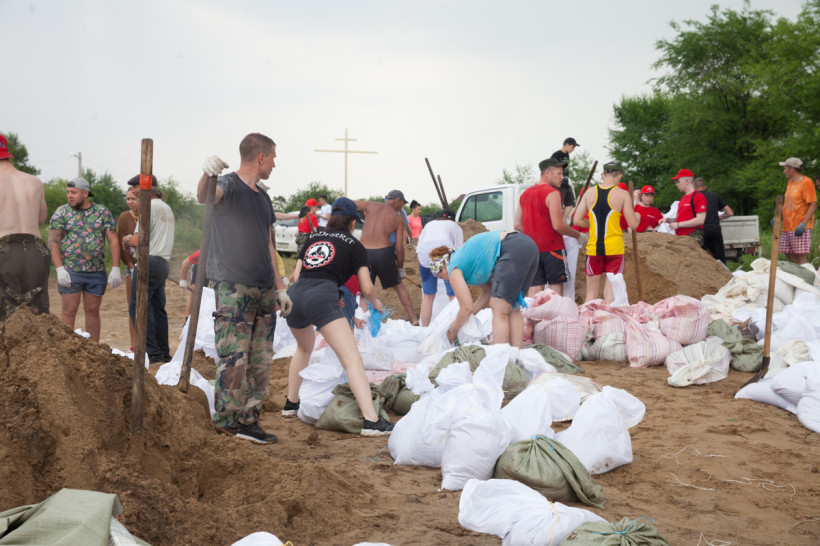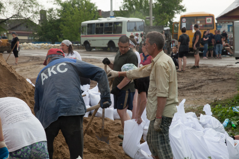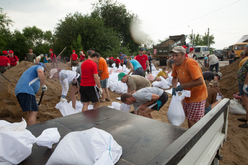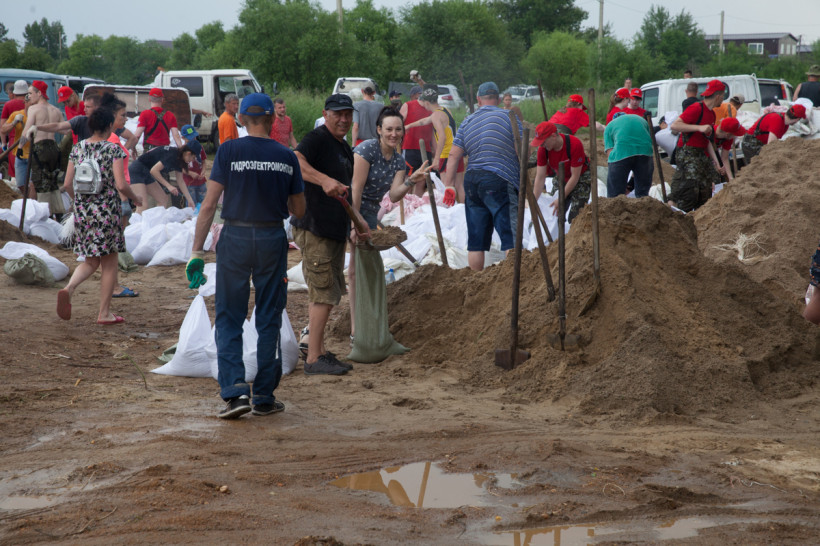 Через несколько сотен метров по Центральной — настоящий человеческий муравейник. Несколько сотен местных жителей и волонтеров ловко набирают песок в мешки и отсыпают дамбу. Отдельно режут завязки неунывающие хохотушки Людмила и Анастасия.