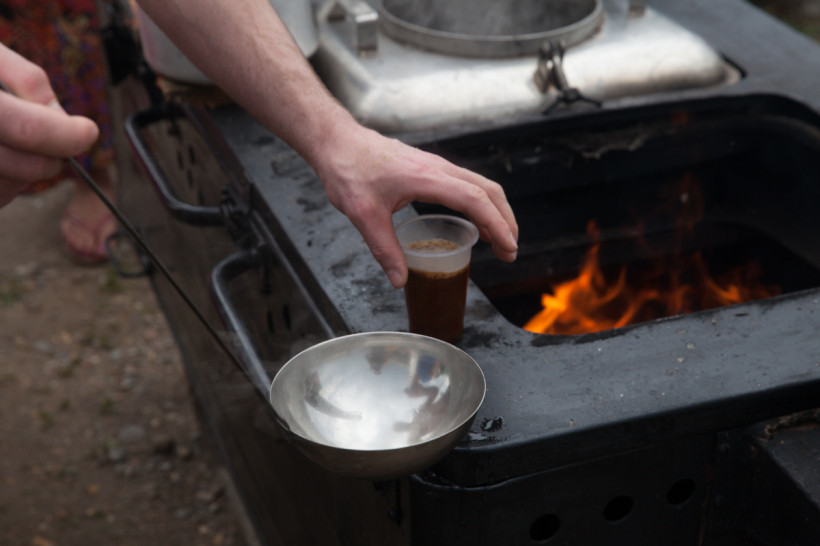 На противоположной части улицы развернулась полевая кухня семьи Фадеевых. В меню сегодня горячая и сытная гречневая каша. Здесь же можно восстановить силы горячим чаем.
