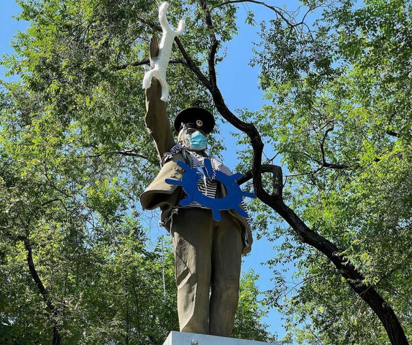 Памятник Владимиру Ленину в сквере возле Центра эстетического воспитания детей в Благовещенске преобразился. За ночь вождя мирового пролетариата приодели в тельняшку и бескозырку, в руки дали разводной ключ, а на грудь повесили штурвал. Не позабыли шутники и про защитную маску.