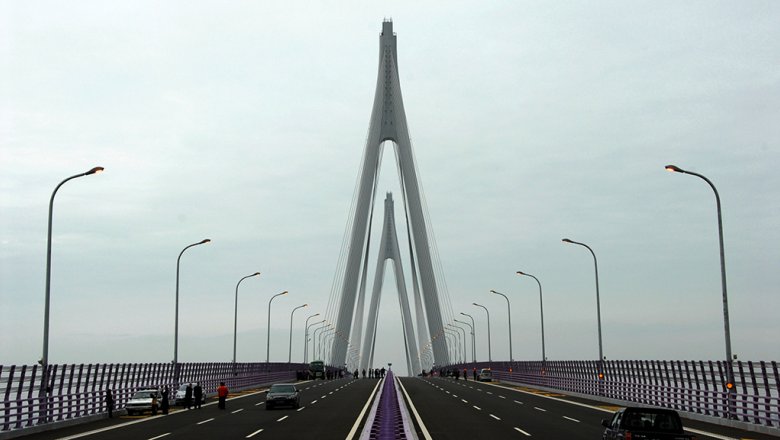 Вантовый мост в заливе Ханчжоувань у восточного побережья Китая является самым длинным трансокеанским мостом в мире. Длина его составляет около 36 километров, движение осуществляется по трем полосам в каждую сторону.