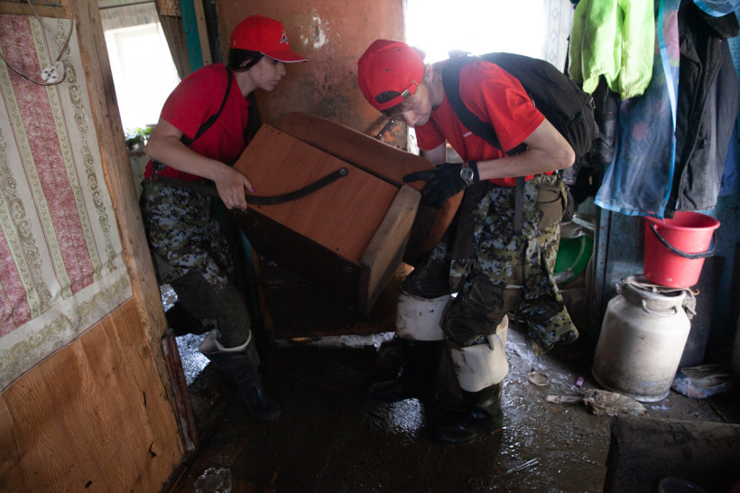 Только за два дня участники «Молодёжки ОНФ» расчистили около 30 домов подтопленцев в селе. Фото: Владимир Воропаев