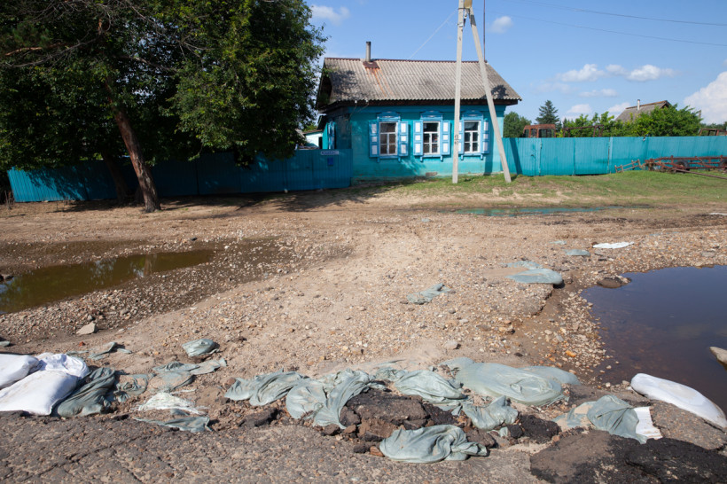 Пока мы добираемся на джипе до улиц Школьной и Пограничной, где еще море, видим признаки ЧС: перевернутые лодки, тяжелую технику, ребят в форме МЧС, шланги, тянущиеся вдоль дороги и выкачивающие воду в Амур, который натворил беды. Над образовавшимся озером по теплотрассе идет девушка с 5-литровкой питьевой воды. На Амурской, которая приняла первый удар волны, мешки с песком. Могучая пограничная река принесла откуда-то диван, обломки деревьев, газобетонные плиты, где-то смыла заборы, туалеты, крыльцо и подкосила сараи. «Я в 2013 году во время наводнения плывущие гробы видел, правда, не у вас, так что, можно сказать, сейчас ничего особенного», — поделился воспоминаниями один из спасателей из Сибири.