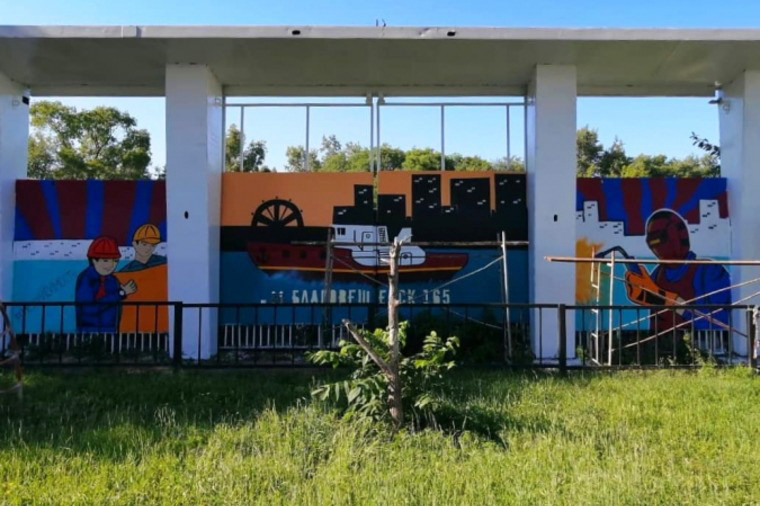 Молодые художники украсили граффити стены ограждения судостроительного завода Благовещенска. Творческая команда Максима Кузнецова-Мельникова изобразила на них работников одного из старейших предприятий города и судно, плывущее по Амуру.