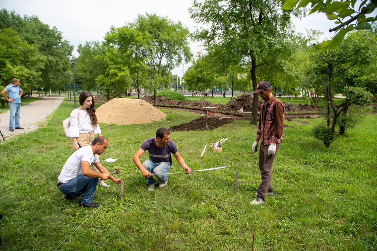 В благовещенском парке Дружбы появится сад камней с декоративным мостом, сухим ручьем и пешеходными дорожками. Сейчас подрядная организация ведет земляные работы — расширяет естественное углубление для ручья, снимает верхний слой грунта и делает разметку для дорожек. Последние будут «шаговыми» — их сделают из отдельных плит бетона, между которыми оставят зазоры для травы.