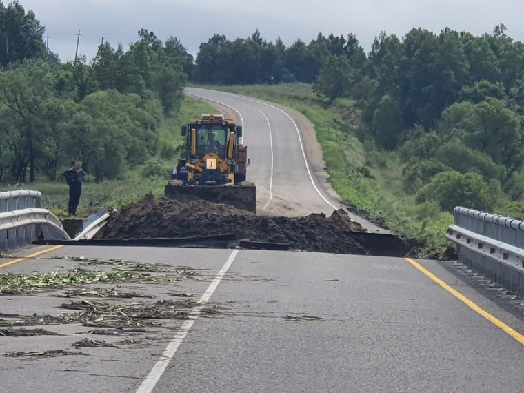В Амурской области приступили к восстановлению размытых в ночь на 1 августа дорог. На 135 километре автодороги Благовещенск — Гомелевка работают два погрузчика, автогрейдер и четыре самосвала. Спецтехника отсыпает участок песчано-гравийной смесью.
