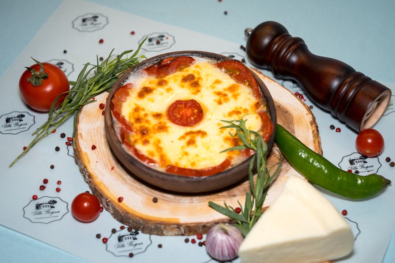 Помидоры и лук нарежьте кольцами. Сулугуни натрите на терке. Зелень измельчите, перемешайте с маслом, солью и перцем. Помидоры, лук, зелень перемешайте и поместите в порционную керамическую огнеупорную форму. Засыпьте сулугуни. Запекайте в духовке, разогретой до 200–220 градусов 7–10 минут. При подаче украсить листочками кинзы.