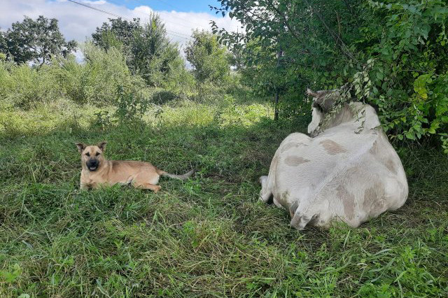 — Год назад у соседей собака ощенилась, мы взяли двух щенков, — продолжила Оксана. — Думали, оба кобельки, а одна девочкой оказалась. Дети ее Джуной назвали. Хорошая собака — ласковая, умная, но что она еще и такая бесстрашная охранница — не ожидала. Сейчас Джуну отвели на безопасное место. Показала ей, где наши коровы живут. Теперь их защищает. За такую смелость устроили ей праздничный молочный обед.