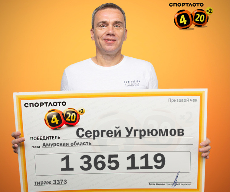 Житель Амурской области Сергей Угрюмов выиграл 1 365 119 рублей в лотерее «Спортлото «4 из 20». Крупную сумму мужчине принес тираж № 3373, разыгранный 17 июня.