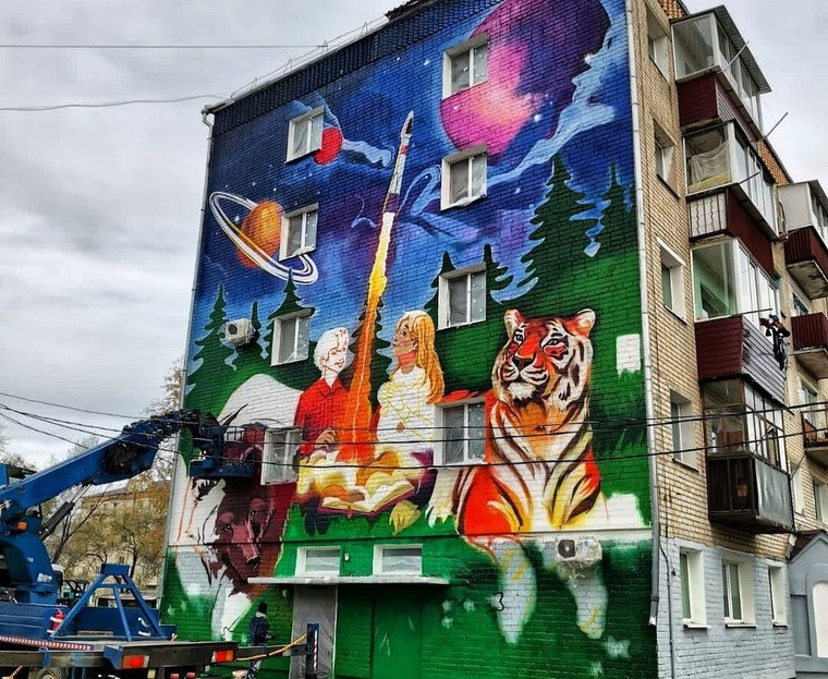 Эскиз Анны Фурман, занявшей первое место, нанесен на фасад дома на Зейской, 43. На стене изображены ракета и космос, амурский тигр и величественная природа.